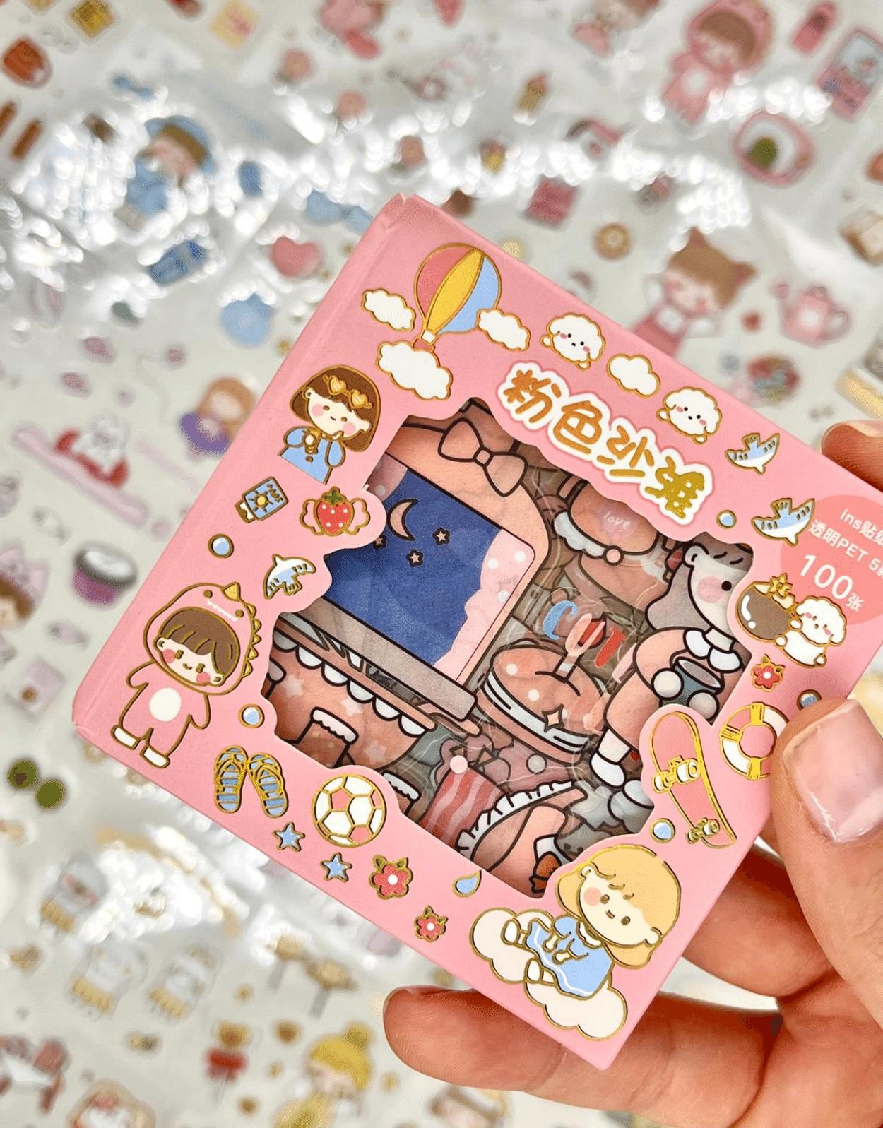 Sevimli Kız ve Tatil Kaykay 100 Yaprak 500 Adet Pembe Mini Kutu Şeffaf Pet Sticker Seti / Etiket/ Çıkartma Su Geçirmez (1512S848)